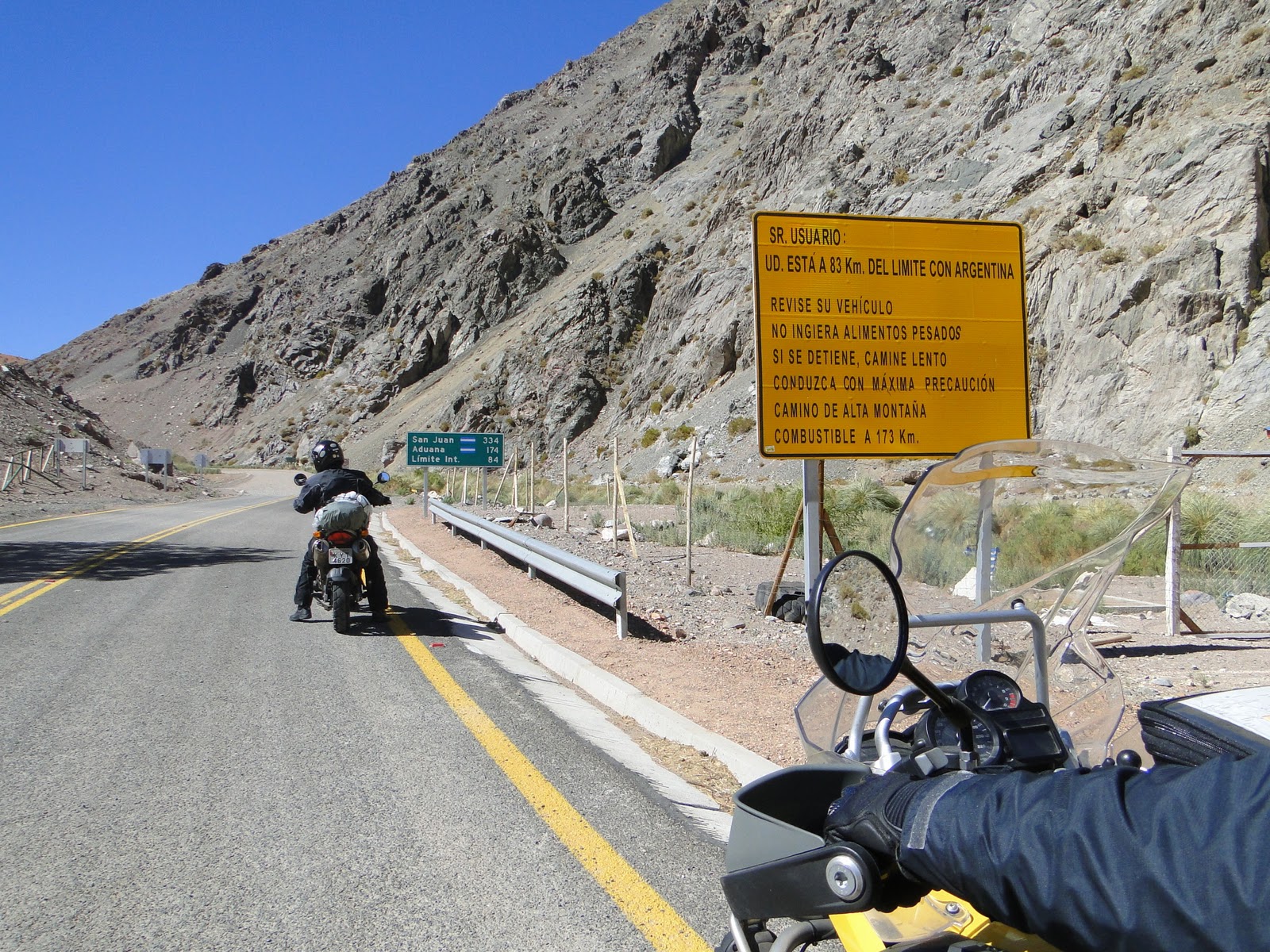 bem o caminho. Voltei atrás de ajuda e encontrei um posto avançado da gendameria (policia) com 3 policiais, um deles fardado (meio abestalhado). Os outros 2 me deram água (quentíssima, que não consegui beber) e fizeram contato, por rádio, com sua base que ficava na alfândega/aduana argentina, mais adiante, informando a situação. Me disseram que só poderiam prestar socorro se houvessem vitimas e que eu deveria ir até essa base buscar ajuda (só mais 20km de rípio e 40km de estrada asfaltada). Moleza para quem estava cansado, "resfolegando", com fome, com sede e preocupado com os amigos. E lá fui eu aos trancos e barrancos (sem trocadilho, pois se desse mole o vento me jogava no abismo ou contra as paredes de pedra e gêlo do morro - bem que ele tentou). Mas o que são 4.000 m.s.n.m para quem foi PQD, só que nunca havia saltado de moto e sem paraquedas (ia ser a minha primeira experiência).