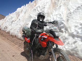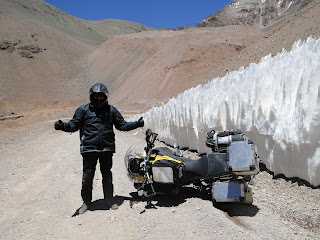 Subimos até 4.800 m.s.n.m (metros sobre o nível do mar), andando por estradas sinuosas de areia e pedras soltas, vento forte, abismo para todo lado, um frio desgraçado e gêlo nas encostas, onde cada metro era conquistado com 10 tombos (sem cair, só o susto), mas a moto escorregava e rebolava o tempo todo (se não sou de circo, já era). Quando já estavamos descendo (4.500 m.s.n.m) a moto do Sandro escorregou, atolou no rípio e ... tchan, tchan, tchan....chão.